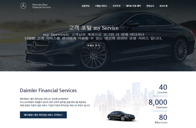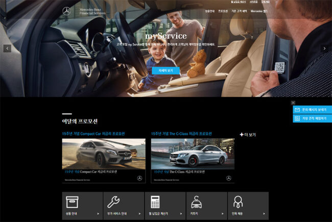 사이트 보기ZoomDetails 메르세데스-벤츠 파이낸셜 서비스 코리아portfolioBy mafigotan2016년 11월 27일메르세데스-벤츠 파이낸셜 서비스 코리아 공식웹사이트 사이트 개발 및 유지관리 2016년 11월